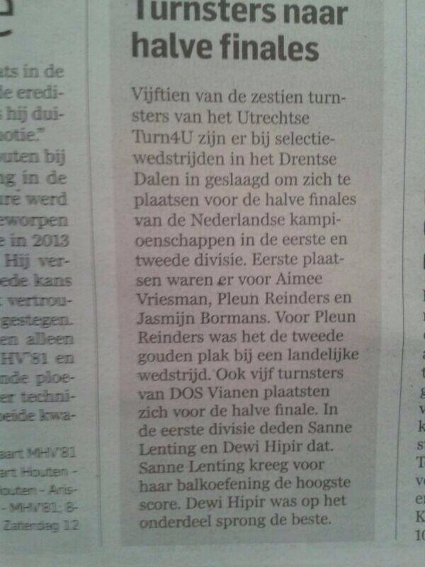 Ik heb de halve finale gehaald van de NK met een gouden medaille. Zondag was het een leuke wedstrijd. Iedereen van Turn4U heeft het super gedaan. We staan in de krant: